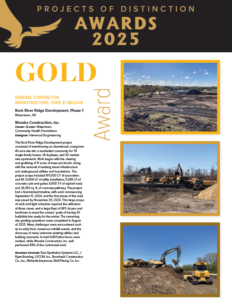 The Rock River Ridge Development project consisted of transforming an abandoned, overgrown 40-acre site into a residential community for 78 single-family homes, 18 duplexes and 92 market rate apartments. Work began with the clearing and grubbing of 11 acres of trees and brush, along with the removal of existing street infrastructure and underground utilities and foundations. The project scope included 197,000 CY of excavation and fill, 12,900 LF of utility installation, 5,065 LF of concrete curb and gutter, 8,900 SY of asphalt road, and 28,353 SF of concrete pathway. The project had a fast-tracked timeline, with work commencing September 12, 2024, and the first phase of the road was paved by November 25, 2024. This large scope of work and tight schedule required the utilization of three crews, and a large fleet of GPS dozers and backhoes to meet the owners’ goals of having 30 buildable lots ready for the winter. The remaining site grading operations were completed in August of 2025. Many challenges were encountered such as an early frost, numerous rainfall events and the discovery of many unknown existing utilities and building remnants. In total 9,461 man hours were worked, while Wondra self-performed 85% of the contracted work.